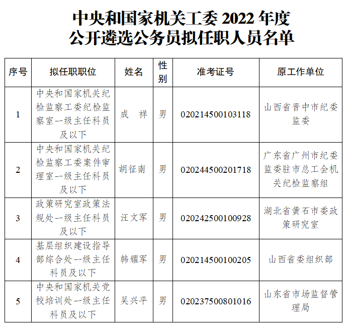 根據(jù)2022年度中央機關(guān)公開遴選公務(wù)員工作有關(guān)要求,經(jīng)過筆試、面試、體檢和考察等程序,確定成祥等5位同志為中央和國家機關(guān)工委公開遴選公務(wù)員擬任職人員(名單詳見附件),現(xiàn)予以公示。公示期間如對人選有異議,請向中央和國家機關(guān)工委組織部反映。