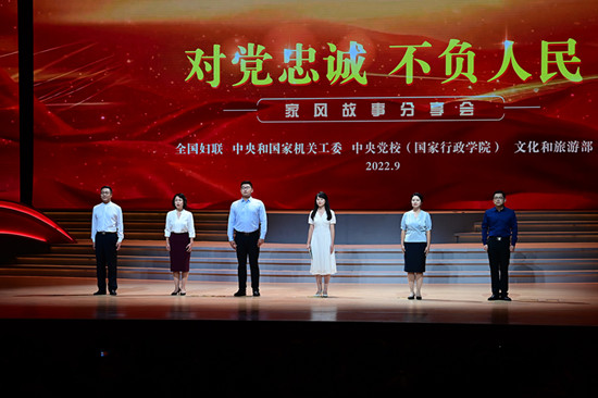 由全國婦聯、中央和國家機關工委等部門聯合主辦的“對黨忠誠 不負人民”家風故事分享會于9月29日在中央黨校(國家行政學院)舉辦。活動旨在深入貫徹落實習近平總書記關于注重家庭家教家風建設重要論述精神,引導黨員干部堅定“對黨忠誠 不負人民”信念,涵養新時代共產黨人的良好家風。全國婦聯黨組書記、副主席、書記處第一書記黃曉薇,中央黨校(國家行政學院)分管日常工作的副校長(副院長)謝春濤,中央和國家機關工委副書記、紀檢監察工委書記王愛文,文化和旅游部黨組成員、副部長、國家文物局黨組書記、局長李群等主辦單位領導出席活動。