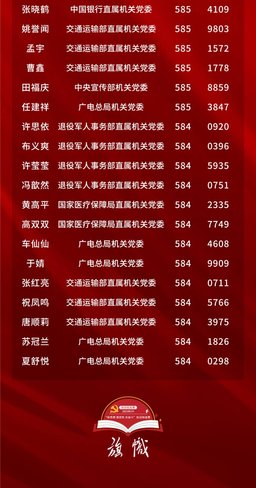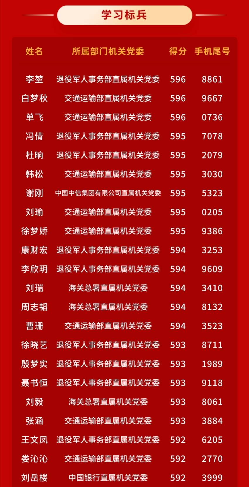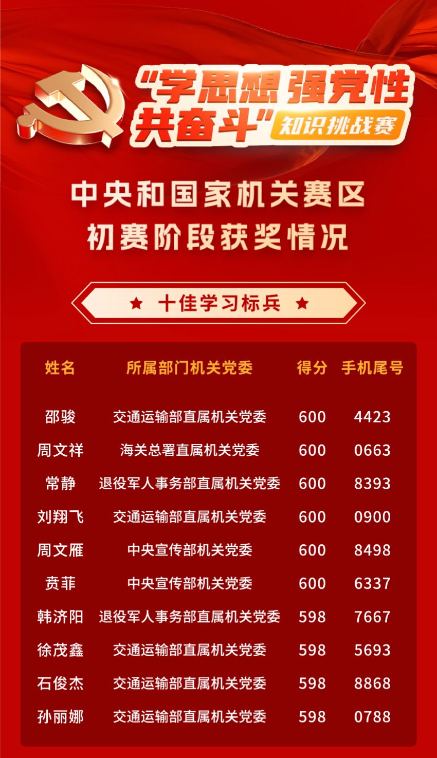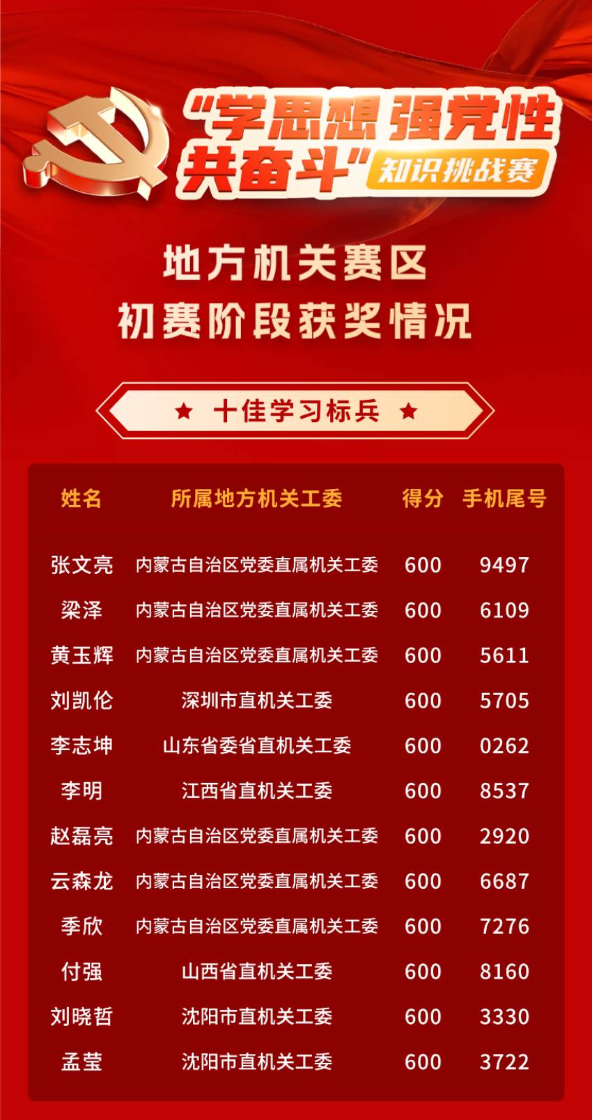 初賽階段已于6月9日順利結(jié)束,在線累計(jì)對局?jǐn)?shù)超過1600萬場,參賽選手們積極踴躍、奮勇爭先,學(xué)習(xí)習(xí)近平新時代中國特色社會主義思想和機(jī)關(guān)黨建知識的氛圍日益濃厚,共有18名選手獲得了滿分成績。為鼓勵在知識挑戰(zhàn)賽初賽階段表現(xiàn)突出的參賽選手,根據(jù)《“學(xué)思想 強(qiáng)黨性 共奮斗”知識挑戰(zhàn)賽初賽階段獎項(xiàng)設(shè)置和獎勵辦法》,現(xiàn)將中央和國家機(jī)關(guān)賽區(qū)、地方機(jī)關(guān)賽區(qū)“十佳學(xué)習(xí)標(biāo)兵”“學(xué)習(xí)標(biāo)兵”獲獎名單通報(bào)如下: